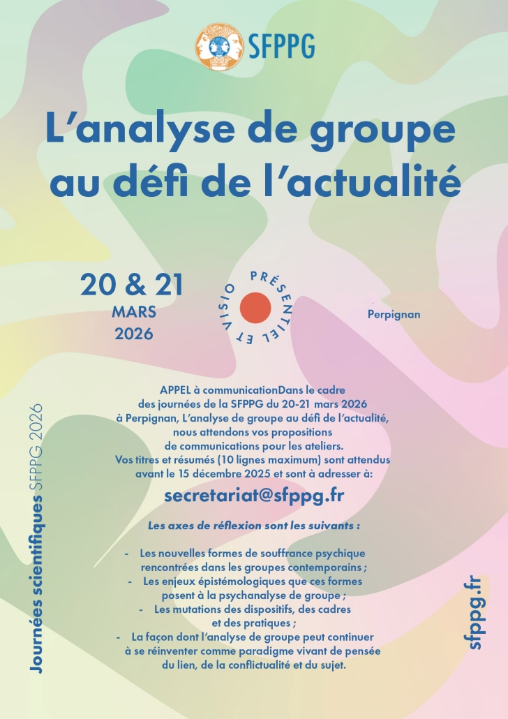 APPEL à communicationDans le cadre des journées de la SFPPG du 20-21 mars 2026 à Perpignan, L’analyse de groupe au défi de l’actualité, nous attendons vos propositions de communications pour les ateliers.Vos titres et résumés (10 lignes maximum) sont attendus avant le 15 décembre 2025 et sont à adresser à secretariat@sfppg.fr